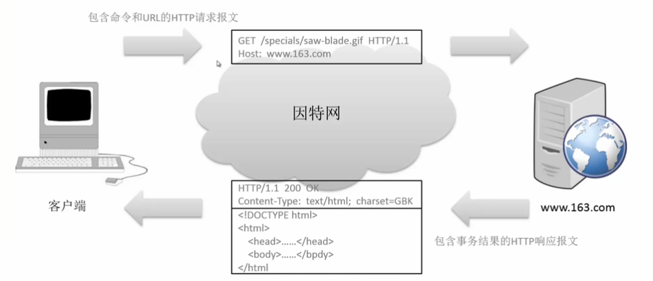 - 请求过程:浏览器向服务器发送一个包含命令和 URL 的请求报文