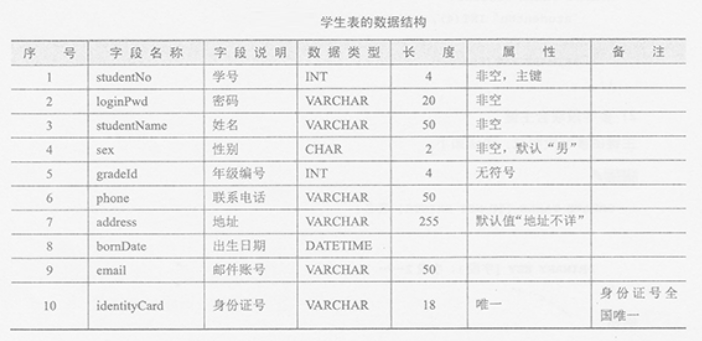 // 学生表代码示例 CREATE TABLE `student`( `studentNo` INT(4) NOT NULL PRIMARY KEY COMMENT '学号', #非空,主键 `loginPwd` VARCHAR(20) NOT NULL COMMENT '密码', `studentName` VARCHAR(50) NOT NULL COMMENT '学生姓名', `sex` CHAR(10) DEFAULT '男' NOT NULL COMMENT '性别', #非空,默认值为'男' `gradeId` INT(4) UNSIGNED COMMENT '年级编号', #无符号数 `phone` VARCHAR(50) COMMENT '联系电话', `address` VARCHAR(255) DEFAULT '地址' COMMENT '地址不详', # 默认值为‘地址不详’ `bornDate` DATETIME COMMENT '出生日期', `email` VARCHAR(50) COMMENT '邮件账号', `identifyCard` VARCHAR(18) UNIQUE KEY COMMENT '身份证号' # 唯一 )COMMENT='学生表';