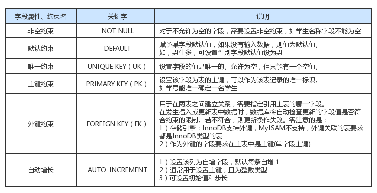 MySQL 中,提供了约束机制以保证数据的完整性。为了对各字段的数据做进一步的确定,可以为字段设置字段约束或属性,以下为常用的 { 字段约束?!}: