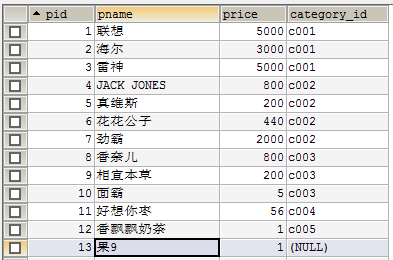 #创建商品表: CREATE TABLE product( pid INT PRIMARY KEY, pname VARCHAR(20), price DOUBLE, category_id VARCHAR(32) ); INSERT INTO product(pid,pname,price,category_id) VALUES(1,'联想',5000,'c001'); INSERT INTO product(pid,pname,price,category_id) VALUES(2,'海尔',3000,'c001'); INSERT INTO product(pid,pname,price,category_id) VALUES(3,'雷神',5000,'c001'); INSERT INTO product(pid,pname,price,category_id) VALUES(4,'JACK JONES',800,'c002'); INSERT INTO product(pid,pname,price,category_id) VALUES(5,'真维斯',200,'c002'); INSERT INTO product(pid,pname,price,category_id) VALUES(6,'花花公子',440,'c002'); INSERT INTO product(pid,pname,price,category_id) VALUES(7,'劲霸',2000,'c002'); INSERT INTO product(pid,pname,price,category_id) VALUES(8,'香奈儿',800,'c003'); INSERT INTO product(pid,pname,price,category_id) VALUES(9,'相宜本草',200,'c003'); INSERT INTO product(pid,pname,price,category_id) VALUES(10,'面霸',5,'c003'); INSERT INTO product(pid,pname,price,category_id) VALUES(11,'好想你枣',56,'c004'); INSERT INTO product(pid,pname,price,category_id) VALUES(12,'香飘飘奶茶',1,'c005'); INSERT INTO product(pid,pname,price,category_id) VALUES(13,'果9',1,NULL);