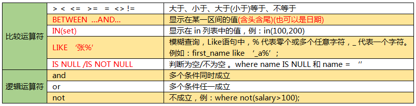 # 查询商品名称为花花公子的商品的所有信息; -- select * from product where `pname`='花花公子'; # 查询价格为800的商品 -- select * from product where `price`=800; # 查询价格不是800的商品的所有信息 -- select * from product where `price`!=800; -- select * from product where `price`<>800; -- select * from product where not(price=800); # 查询价格大于60的商品的所有信息 -- select * from product where price>60; # 查询价格在200到1000之间的商品的所有信息 -- select * from product where price between 200 and 1000; -- select * from product where price>=200 and price<=1000; # 查询商品价格是200或800的商品的所有信息 -- select * from product where price=200 or price=800; -- select * from product where price in(200,800); # 查询商品名称含有“霸”字的商品的所有信息 -- select * from product where pname like '%霸%'; # 查询商品名称以“香”开头的商品的所有信息 -- select * from product where pname like '香%'; # 查询商品名称的第二个字是“想”的商品的所有信息 -- select * from product where pname like '_想%'; # 查询没有分类的商品的所有信息 -- select * from product where category_id is null; # 查询有分类的商品的所有信息 -- select * from product where category_id is not null; # 查询价格大于2000的电脑商品(category_id是c001)或者价格大于1000的服装商品(category_id是c002) -- select * from product where (price>2000 and category_id='c001') or (price>1000 and category_id='c002');