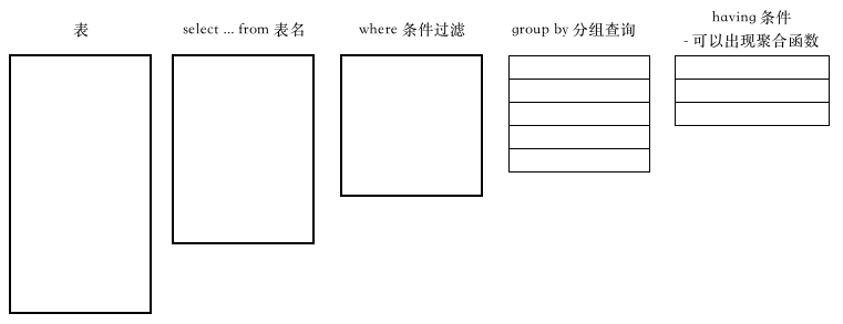 # 基本语法 select ... from 表名 group by 分组字段 having 分组条件; 说明: 1)先分组,再查询 — 具体查询到的结果数,取决于分了多少组 2)分组后,如果需要条件判断,使用having // having不同于where,其后面可以有聚合函数