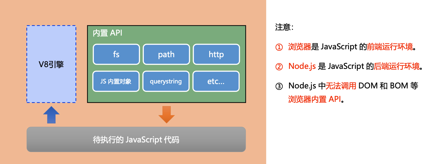 - 有对应的编程语言 — Node.js 使用的编程语言是 JavaScript // 浏览器中的 JavaScript 运行环境