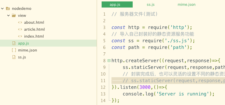 // 服务器文件( 入口文件 ) app.js const http = require('http'); // 导入自己封装好的静态资源服务功能 const ss = require('./ss.js'); const path = require('path'); http.createServer((request,response)=>{ ss.staticServer(request,response,path.join(__dirname,'view')); // 根路径 // 封装完成后,也可以灵活的设置不同的静态资源的根路径,类似: // ss.staticServer(request,response,path.join('C:\\Users\\view\\Destop’,'test')); }).listen(3000,()=>{ console.log('Server is running'); });