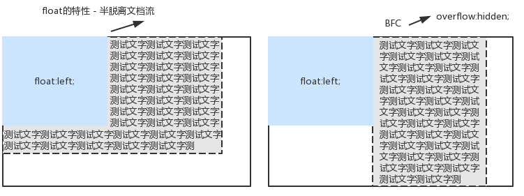 所以,普通流体元素BFC后,为了和浮动元素不产生任何交集,会顺着浮动边缘形成自己的封闭上下文