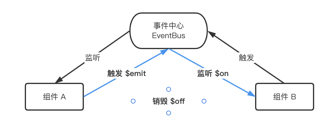 # 方式 1:局部的事件总线 // event-bus.js import Vue from 'vue' export const EventBus = new Vue() // 在组件中使用 import { EventBus } from "../event-bus.js" // 引入 EventBus.$emit("aMsg", '来自A页面的消息') // 触发 EventBus.$on("aMsg", (msg) => { // 监听 // A发送来的消息 this.msg = msg; }) # 方式 2:初始化为一个全局的事件总线 // main.js Vue.prototype.$EventBus = new Vue()