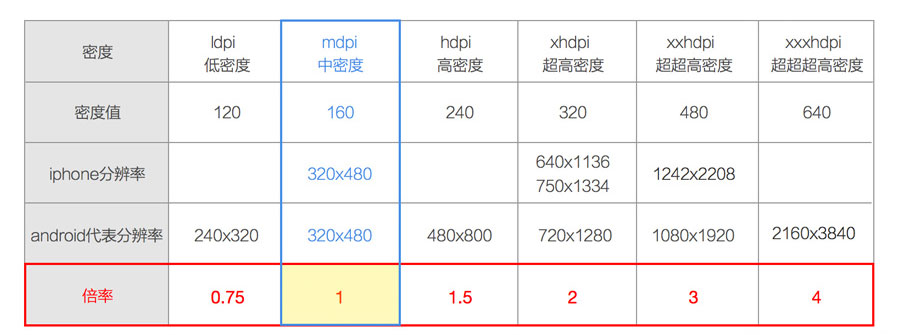 最下面一行红色的倍率,以mdpi 中密度的密度值为基数,可以算出各屏幕密度值的倍率是0.75:1:1.5:2:3:4。