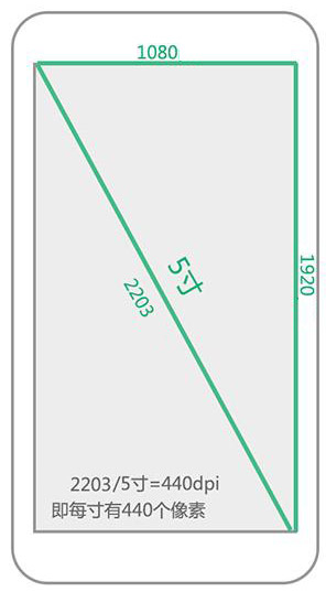 屏幕像素密度 = 对角线分辨率 / 屏幕尺寸 对角线的分辨率 = √(1920²+1080²)≈2203 对角线分辨率除以屏幕尺寸:2203/5≈440dpi