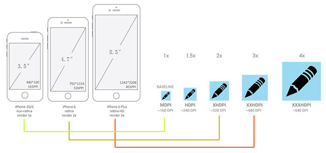 实际开发中,以1倍的mdpi作为基准。像素密度更高或者更低的设备,只需乘以相应的倍率,就能得到与基准倍率近似的显示效果。无论什么样的屏幕,倍率是多少,都按逻辑像素尺寸来设计和开发页面。只不过在准备资源图的时候,需要准备2倍大小的图,通过代码把它缩成1倍大小显示,才能保证清晰。