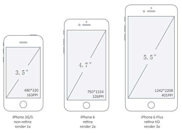 由此可以看出,苹果以普通屏为基准,给Retina屏定义了一个2倍的倍率(iPhone 6plus除外,它达到了3倍)。