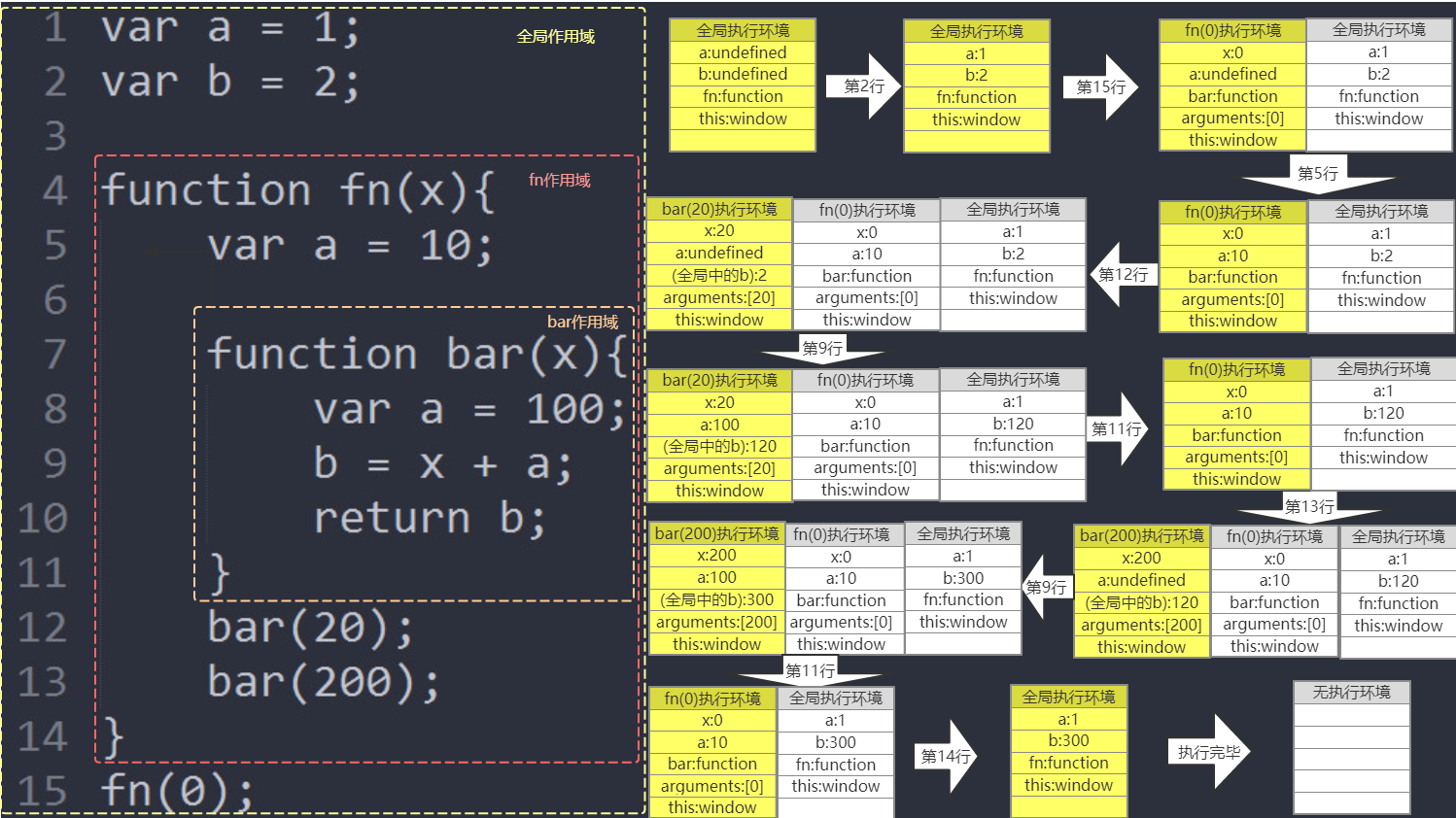 // 下面按照代码执行流的顺序对该图示进行详细说明: 1. 代码执行流进入全局执行环境,并对全局执行环境中的代码进入声明提升(hoisting) 2. 执行流执行第1行代码var a = 1;,对a进行LHS查询,给a赋值1;执行流执行第2行代码var b = 2;,对b进行LHS查询,给b赋值2 3. 执行流执行第15行代码fn(0);,调用fn(0)函数,此时执行流进入fn(0)函数执行环境中,对该执行环境中的代码进行声明提升过程,并将实参0赋值给形参x中。此时执行环境栈中存在两个执行环境,fn(0)函数为当前执行流所在执行环境。 4. 执行流执行第5行代码var a = 10;,对a进行LHS查询,给a赋值10 5. 执行流执行第12行代码bar(20);,调用bar(20)函数,此时执行流进入bar(20)函数执行环境中,对该执行环境中的代码进行声明提升过程,并将实参20赋值给形参x中。此时执行环境栈中存在三个执行环境,bar(20)函数为当前执行流所在执行环境。 在声明提升的过程中,由于b是个自由变量,需要通过bar()函数的作用域链bar() -> fn() -> 全局作用域进行查找,最终在全局作用域中也就是代码第2行找到var b = 2;,然后在全局执行环境中找到b的值是2,所以给b赋值2。 6. 执行流执行第8行代码var a = 100;,给a赋值100;执行流执行第9行b = x + a;,对x进行RHS查询,找到x的值是20,对a进行RHS查询,找到a的值是100,所以通过计算b的值是120,给b赋值120;执行第10行代码return b;,对b进行RHS查询,找到b的值是120,所以函数返回值为120。 7. 执行流执行完第10行代码后,bar(20)的执行环境被弹出执行环境栈,并被销毁,等待垃圾回收,控制权交还给fn(0)函数的执行环境。 8. 执行流执行第13行代码bar(200);,调用bar(200)函数,此时执行流进入bar(200)函数执行环境中,对该执行环境中的代码进行声明提升过程,并将实参200赋值给形参x中。此时执行环境栈中存在三个执行环境,bar(200)函数为当前执行流所在执行环境 与第5步相同,在声明提升的过程中,由于b是个自由变量,需要通过bar()函数的作用域链bar() -> fn() -> 全局作用域进行查找,最终在全局作用域中也就是代码第2行找到更新后的var b = 120,然后在全局执行环境中找到b的值是120,所以给b赋值120。 9. 与第6步相同,执行流执行第8行代码var a = 100;,给a赋值100;执行流执行第9行b = x + a;,对x进行RHS查询,找到x的值是200,对a进行RHS查询,找到a的值是100,所以通过计算b的值是300,给b赋值300;执行第10行代码return b;,对b进行RHS查询,找到b的值是300,所以函数返回值为300。 10. 执行流执行完第10行代码后,bar(200)的执行环境被弹出执行环境栈,并被销毁,等待垃圾回收,控制权交还给fn(0)函数的执行环境。 11. 执行流执行第14行代码},fn(0)的执行环境被弹出执行环境栈,并被销毁,等待垃圾回收,控制权交还给全局执行环境。 12. 当页面关闭时,全局执行环境被销毁,页面再无执行环境。