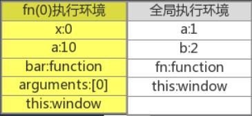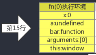 当代码执行到第15行时,fn(0)函数的执行环境里的变量对象保存了fn()函数作用域内所有的变量和函数的值。