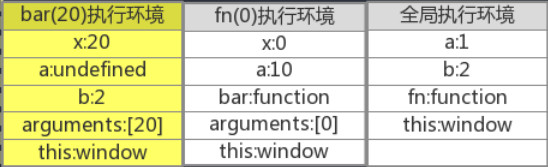 - 当bar(20)函数执行完成后,当前程序的执行环境栈如下图所示,bar(20)函数的执行环境被销毁,等待垃圾回收,控制权交还给黄色背景的fn(0)执行环境。