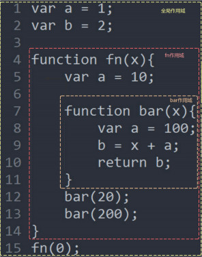 // 示例:以下存在着全局作用域,fn作用域和bar作用域,它们相互嵌套。