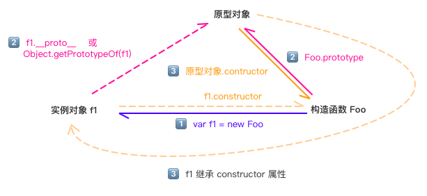 以上代码的原型对象是Foo.prototype,实例对象是f1,构造函数是Foo