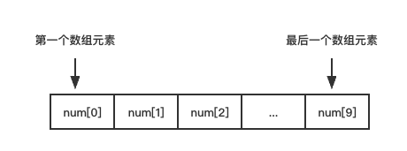 - 相对于一个个的声明变量 num0、num1 ... num9,数组形式 num[0],num[1] ... num[9] 更加方便,且易于扩展