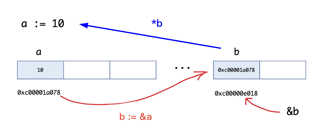 // (1)指针的寻址( & )和 取值( * ) var a int = 10 var aPointer *int = &a // 通过 & 寻址,内存地址 0x1400011c020 fmt.Println(aPointer) fmt.Println(*aPointer) // 通过 * 指向,获取具体的值 10 // (2)数组指针:首先,它是一个指针,然后,它指向数组 // 区别于(3)指针数组( 一个数组元素为指针的数组,具体见数组 ) arr := [5]int{1, 2, 3, 4, 5} var arrPointer *[5]int = &arr fmt.Println(arrPointer) // &[1 2 3 4 5] fmt.Println(*arrPointer) // [1 2 3 4 5] // (4)相应的,指针可以指向各种数据类型的内存地址 slice、map ... // (5)指向指针的指针( 可以有多级,以此类推 ) var b int = 10 // 具体的值 // 一级指针 var bPointer *int = &b fmt.Println(bPointer, *bPointer) // 0x140000a4050 10 // 二级指针:var ptr **int 使用 **ptr,可以获取具体的值 var bbPointer **int = &bPointer fmt.Println(bbPointer, *bbPointer, **bbPointer) // 0x14000120020 0x14000126050 10