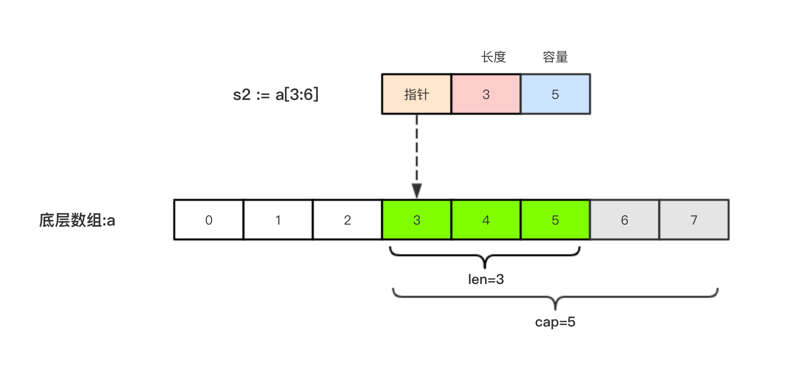 a := [5]int{1, 2, 3, 4, 5} // s := a[low:high] s := a[1:3] fmt.Printf("s:%v len(s):%v cap(s):%v\n", s, len(s), cap(s)) // s:[2 3] len(s):2 cap(s):4 // 索引的上限是cap(s),而不是len(s) s2 := s[3:4] fmt.Printf("s2:%v len(s2):%v cap(s2):%v\n", s2, len(s2), cap(s2)) // s2:[5] len(s2):1 cap(s2):1