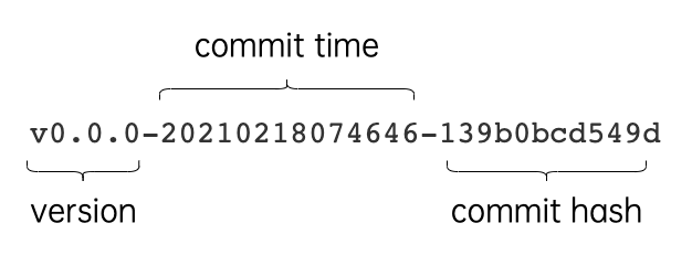 引入某些没有发布过 tag 版本标识的依赖包时,go.mod 中记录的依赖版本信息就会出现类似 v0.0.0-20210218074646-139b0bcd549d 的格式,由版本号、commit 时间和 commit 的 hash 值组成