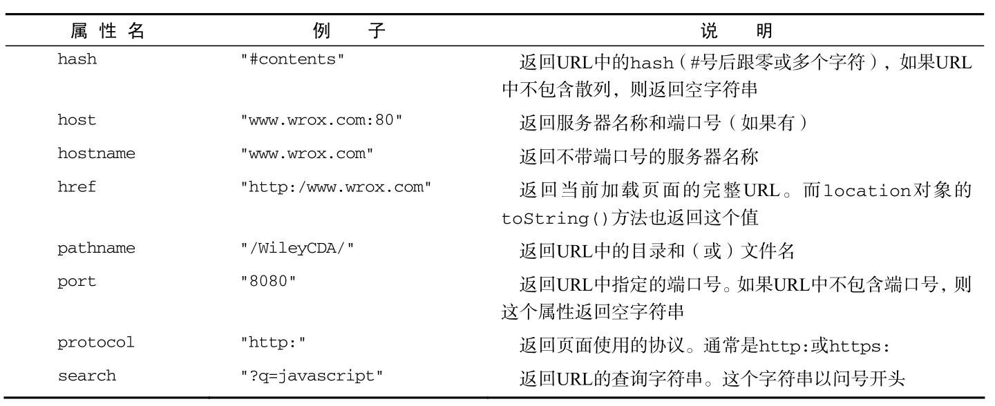 //修改hash值 location.hash = "#section1"; //修改查询字符串 location.search = "?q=javascript"; //修改主机名 location.hostname = "www.baidu.com" //修改路径 location.pathname = "mydir" //修改端口号 location.port = "8080"