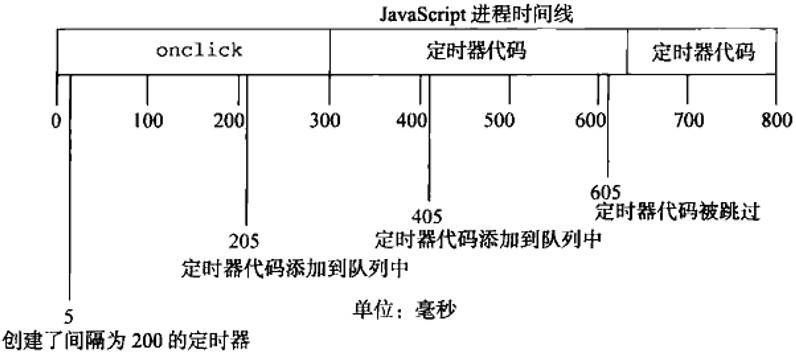 例子中的第一个定时器是在205ms处添加到队列中的,但是直到过了300ms处才能执行。当执行这个定时器代码时,在405ms处又给队列添加了另一个副本。在下一个间隔,即605ms处,第一个定时器代码仍在运行,同时在队列中已经有了一个定时器代码的实例。结果是,在这个时间点上的定时器代码不会被添加到队列中