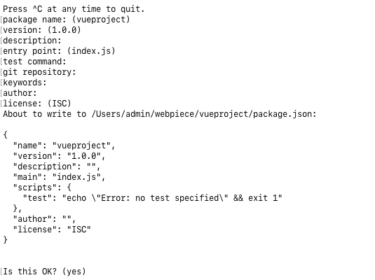进入项目文件存储目录,如webpiece,然后依次输入: mkdir vueproject // 创建项目目录 cd vueproject // 进入项目目录 npm init // 创建项目描述文件 package.json