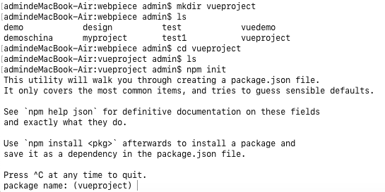 进入项目文件存储目录,如webpiece,然后依次输入: mkdir vueproject // 创建项目目录 cd vueproject // 进入项目目录 npm init // 创建项目描述文件 package.json // package.json 文件里记录项目的描述信息:项目作者、项目描述、项目依赖哪些包、插件配置信息等等数不清的好处。