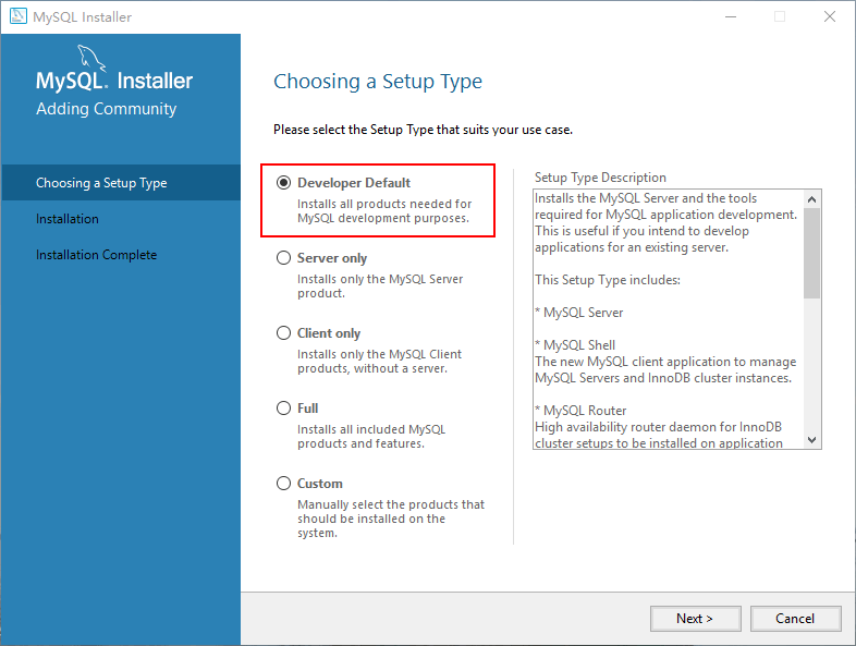 - Development Machine(开发机器):安装的 MySQL 服务器作为开发机器的一部分,在三种可选的类型中,占用的内存最少;
