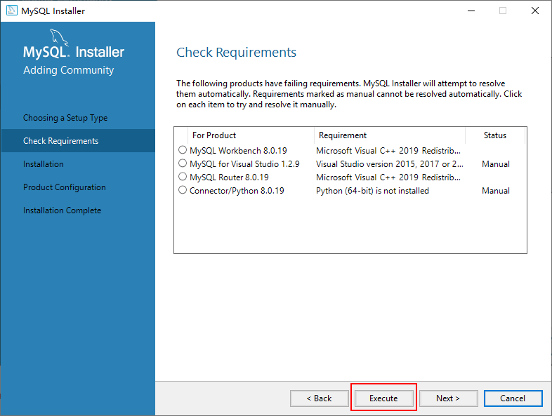 步骤 6:进入安装确认窗口,点击 “execute” 按钮,开始 MySQL 各个组件的安装。