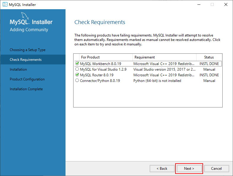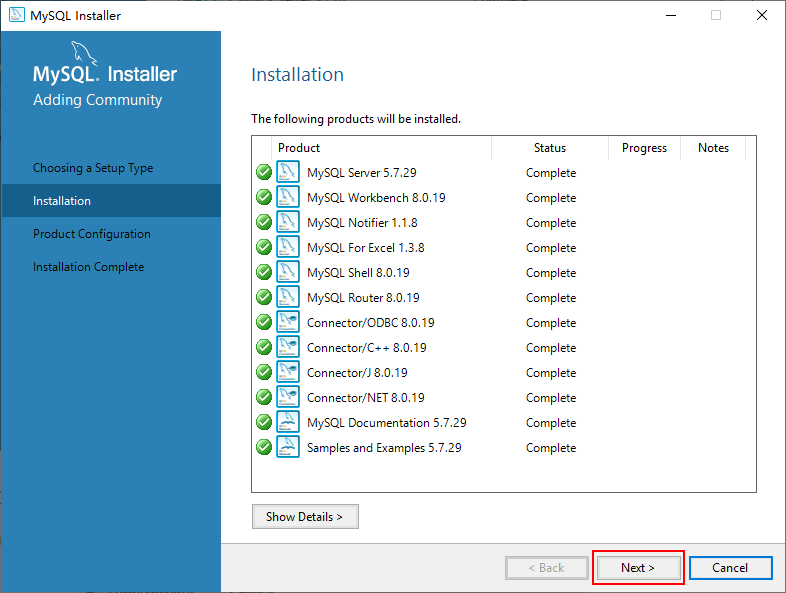 步骤 7:开始安装 MySQL 文件,安装完成后 “status” 列表下显示 "complate"。