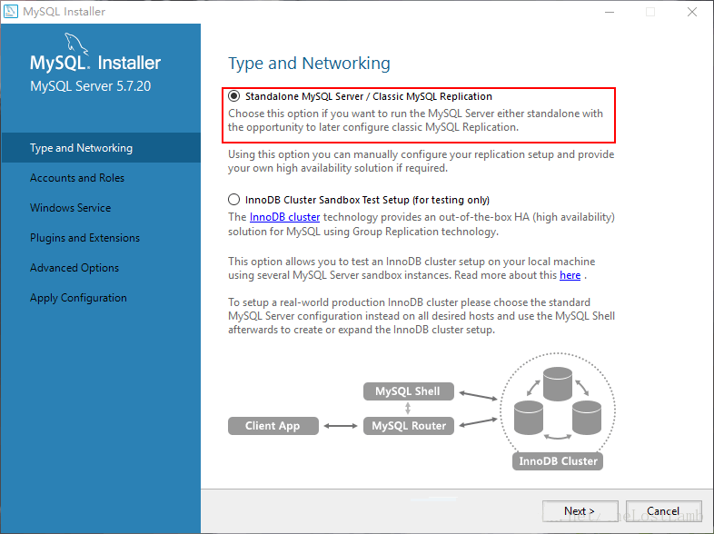 步骤 2:进入 MySQL 网络类型配置窗口,采用默认配置,点击“next”按钮。