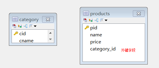 “分类表category”称为:主表,“cid”我们称为主键。“商品表products”称为:从表,category_id称为外键。