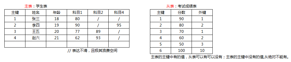 - 从表外键的值是对主表主键的引用。